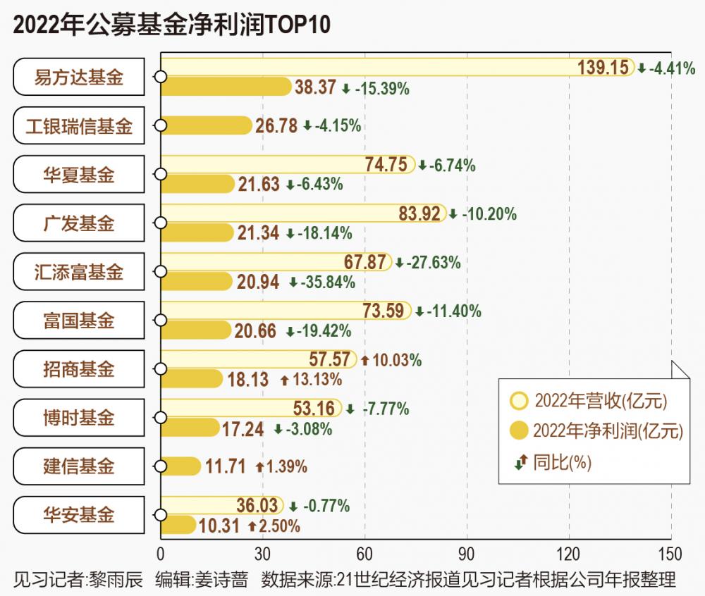 其中,易方达基金同样维持了去年的冠军地位,营收和净利润分别为139.15亿元和38.37亿元,虽然同比分别下降4.42%、15.38%,但依然是去年唯一一家营收破百亿元、净利润破30亿元的公募基金公司。