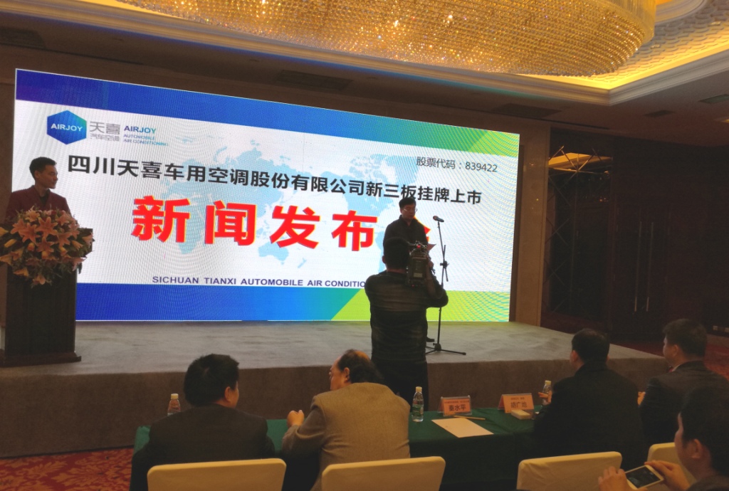 隔天,2016年11月11日上午,秋高气爽,四川天喜车用空调股份有限公司新三板挂牌上市新闻发布会在四川南充君颐尚渡酒店宴会厅举行。